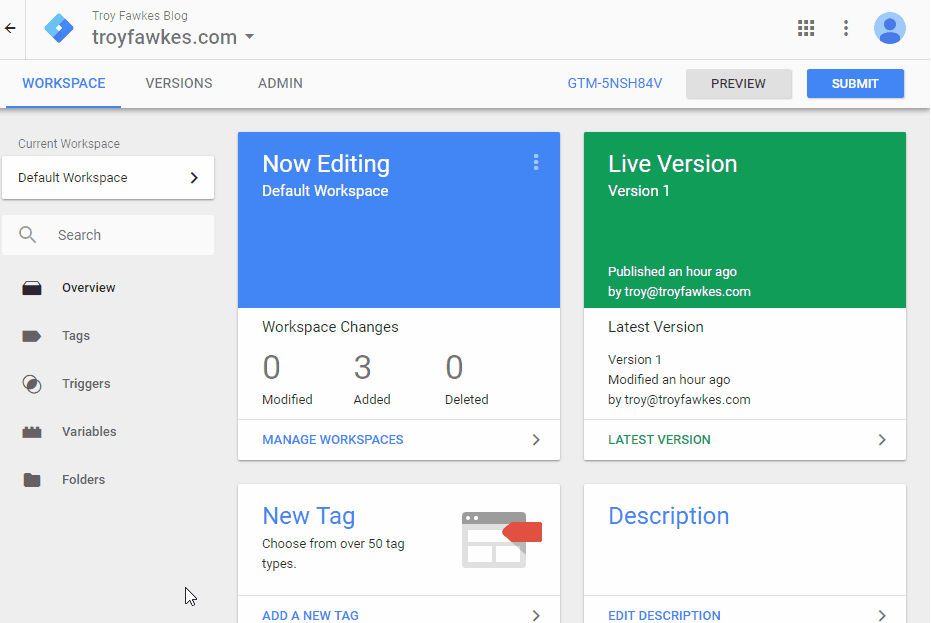 Before moving on you need to know that Google Tag Manager doesn’t make changes instantly to your website. You have to submit your changes. This also allows you to revert back to previous versions if ever you make a mistake. After every step in this tutorial, feel free to publish your changes.